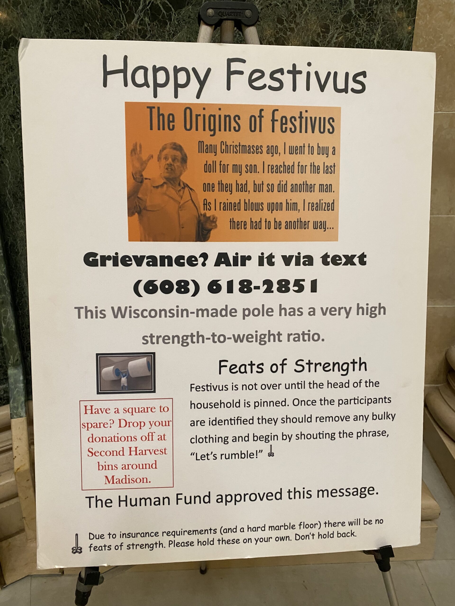 The Festivus Pole has returned to the Wisconsin Capitol. Tucked away on the second floor of the rotunda, the Wisconsin made aluminum pole is a reference to the holiday invented by Frank Costanza, memorably played by Jerry Stiller on the TV show “Seinfeld.” A big part of Festivus: the Airing of Grievances, and a sign next to the pole invites you to text your grievances to 608-618-2851, and to drop donations at Second Harvest bins around Madison.
